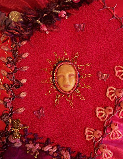 I made a couple of these polymer clay faces to audition as the main motif on my black stocking, but hadn't sewn them on yet. On a whim I tucked one into the blankie on Miranda's stocking. I didn't like it, or the blankie, and eventually removed them both. Miranda saw it, though, and loved the sleeping baby, as she called it. So, I sewed it back onto her stocking without the blankie and then surrounded it with two rows of beads.I am behind schedule on these stockings. I really wanted them done by the 1st of December. However, they are very close to finished now. I am into crunch time and I do get more done that way. I have a few pictures of newer additions to the stockings and will add them to the blog with a short blurb as I get time. I thought I might be able to finish them this weekend, but Miranda and I are sick, so it's unlikely. Soon, though.